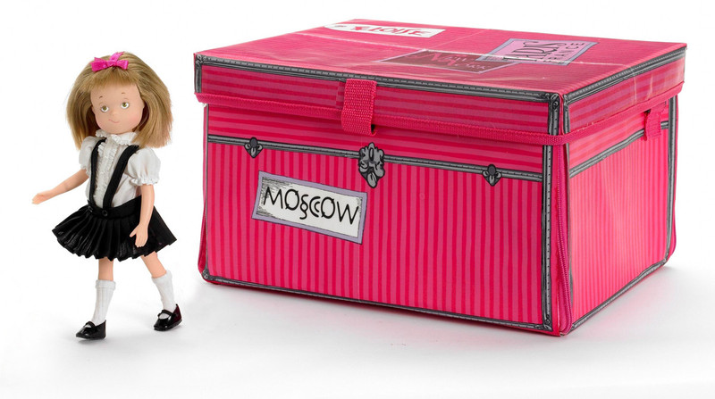 This Madame Alexander Eloise doll is dressed in her traditional black jumper outfit with a hot pink bow in her hair. She is ready to travel in her included travel case.