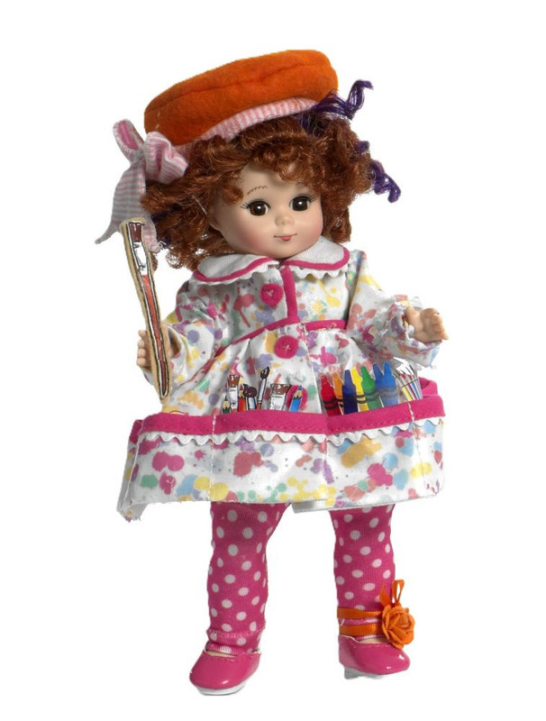 This Madame Alexander Aspiring Artist Fancy Nancy doll is dressed in a white blouse paired with pink-with-white polka dot Lycra pants. Over this outfit she wears a ‘paint spattered’ smock that has pockets in the front that hold screen-printed painting tools. And of course every true artist needs a beret! She carries a quilted paintbrush in her hand