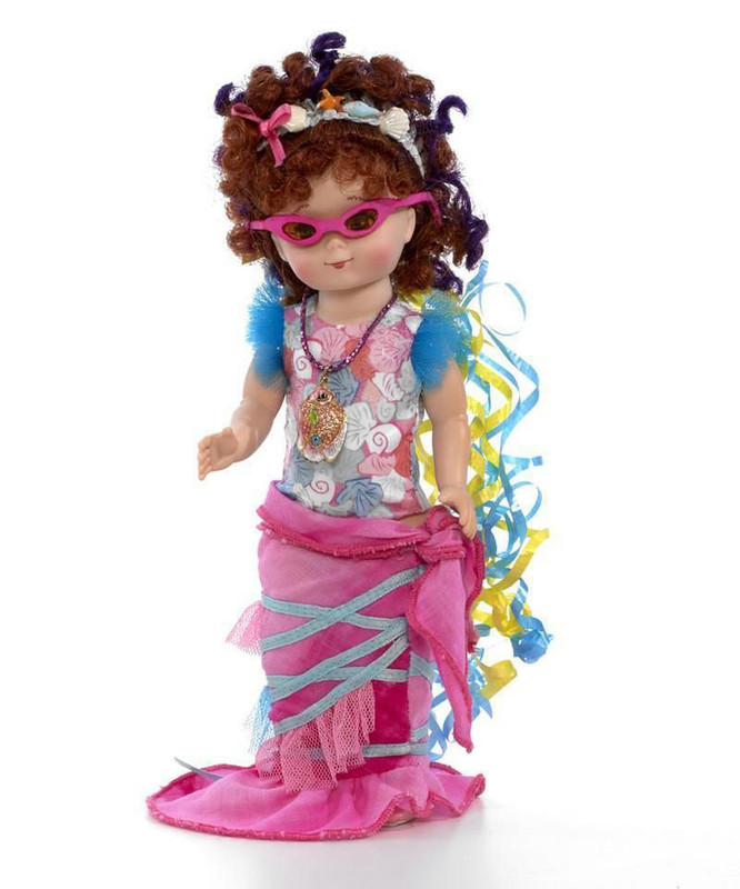 This Madame Alexander Mermaid Ballet Fancy Nancy doll is dressed in a pink tail outfit with a seashell print top trimmed with blue tulle sleeves. She wears a shell decorated headband, sun glasses, and a fish bead necklace.