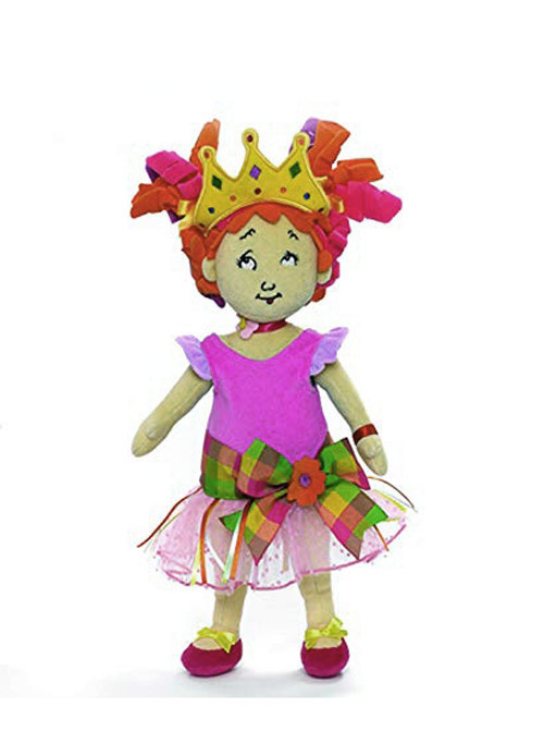 This Madame Alexander Fancy Nancy™ and her clothes can be machine washed and dried on gentle cycle, perfect for little ones that love to play with their doll. Made out of tan velboa, with purple hair that’s styled into two ponytails that have lime green ribbon ties. She is dressed in a pink velboa shirt that has purple ruffled sleeves. and paired with a sheer pink skirt with white polka dots. Delightful details such as an orange ribbon with a green bow on the right side of her skirt and a pink plaid waistband with a bow, that features an orange flower, add zip to an outfit that is beyond cute. Her feet are attached red velboa shoes with yellow bows.