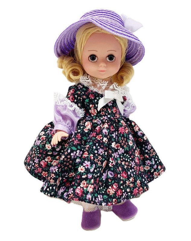 This Floral Outing Madame Alexander doll is dressed in a flowered print dress with purple sleeves, lavender fuzzy shoes, and a matching color hat trimmed with a white bow.