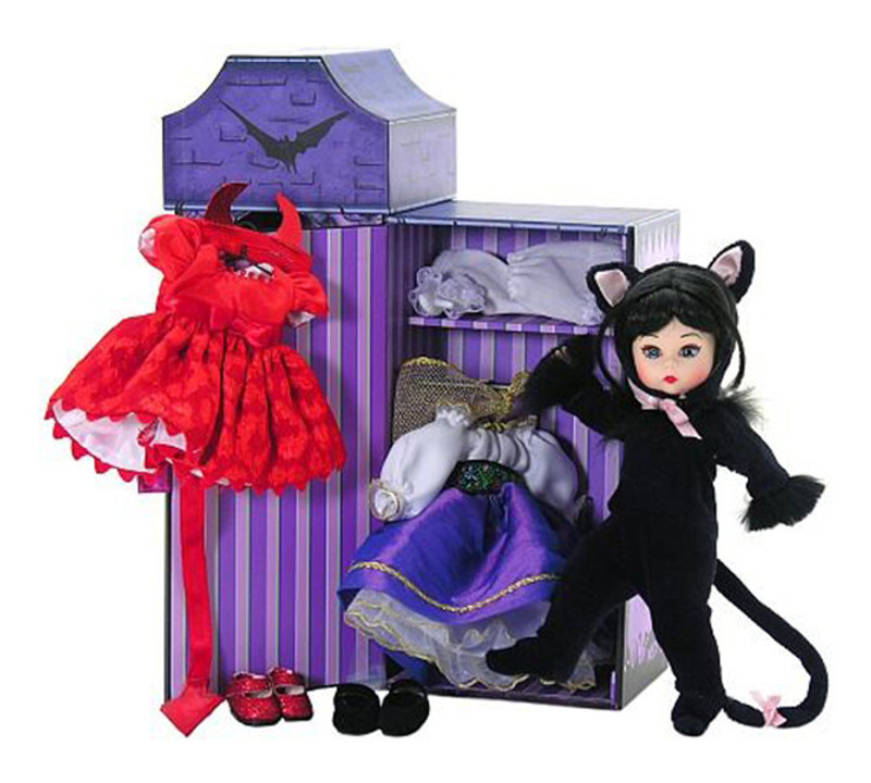 This Madame Alexander Haunted Delight doll comes dressed as a black velvet cat in a heavy board haunted house shaped trunk. In the trunk is a red satin devil dress with tail, devil horn headband, and red sparkle shoes. There is a purple and white taffeta gypsy dress with a metallic net head scarf, lace undergarments, socks, and black shoes. Two hangers are included for the outfits