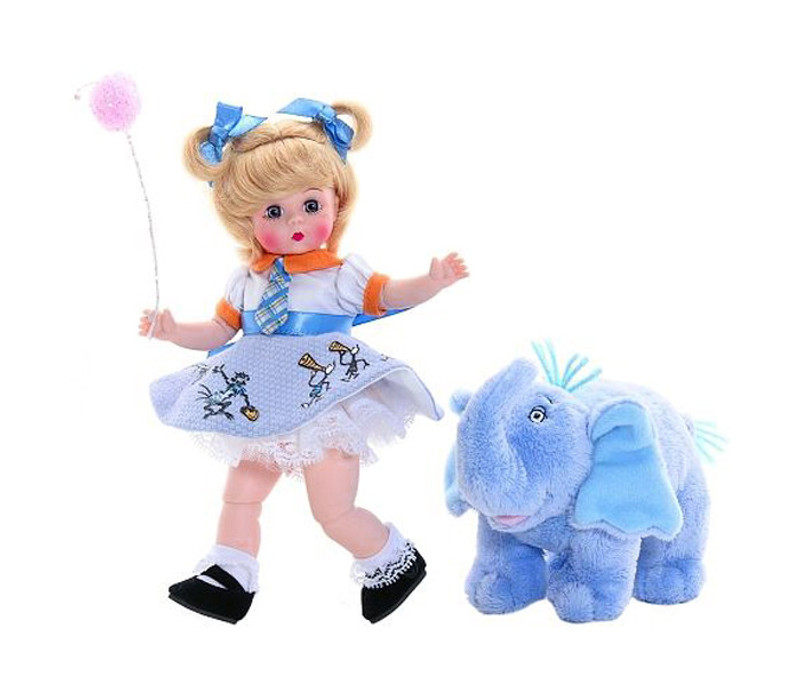 This Madame Alexander Horton Hears A Who Doll Dr Seuss character doll wears a white blouse with yellow accents and a tie, a blue skirt with images, and 2 blue bows in her hair. She comes with a 6" L blue plush Horton Elephant, and a long stick of pink cotton candy.
