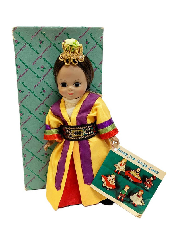 This Madame Alexander Korea doll wears a golden rayon long robe trimmed with purple, green, red, and a gold metallic brocade waist ribbon. Underneath is a red skirt, and she has a gold tiny headpiece.