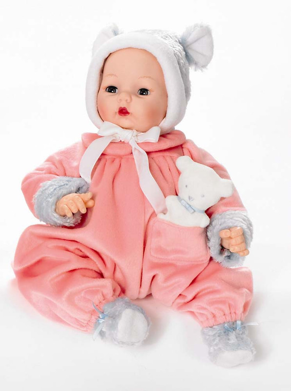 This Madame Alexander Baby doll is dressed in pink soft velour jumpsuit trimmed with bay blue cuffs. She wears a matching blue bonnet with bear ears, and booties. She has her own stuffed mini white bear with baby blue accents.