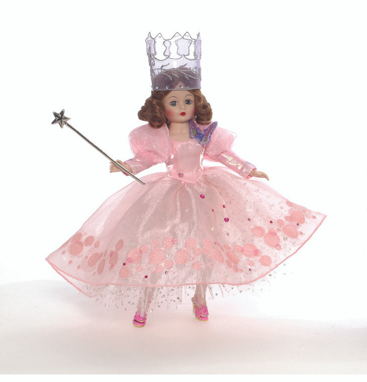 The Magic Bubble Glinda Good Witch doll has a pink dress has embroidered bubbles and a purple butterfly, she wears a high crown, and comes with a star wand