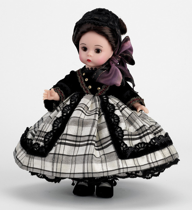 This Madame Alexander Marmee Little Women Mom doll is a special numbered edition dressed in a black plaid taffeta gown complete with a shawl. She has special twist braids in her hair.