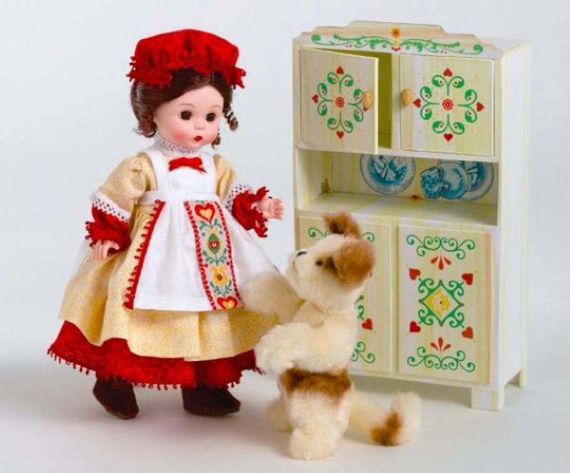 This Madame Alexander Old Mother Hubbard Nursery Rhyme doll is dressed in her apron cooking dress with bonnet. She comes with a plush Danger the dog and a wooden cupboard that is bare