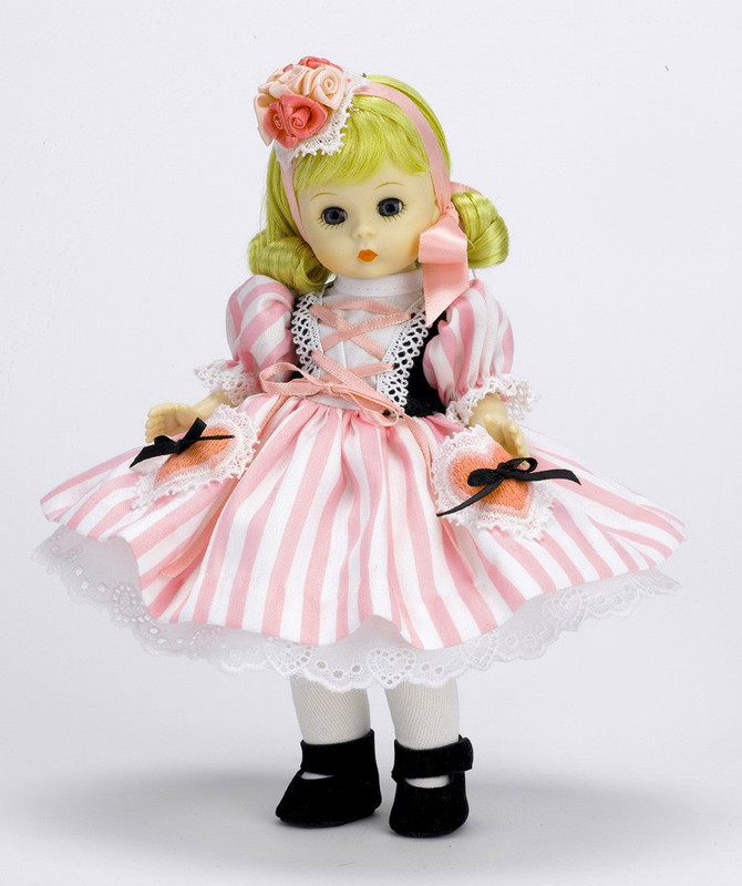 This Madame Alexander Only Hearts Valentines doll is dressed in her pink and white striped dress with an embroidered heart applique pocket on each side, it has a black trimmed criss-cross tie bodice with puff sleeves, She has black shoes, white leotards, and a pink ribbon roses heart shaped tie on head band hairpiece.