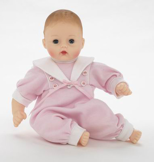 Dressed in a soft one piece pink knit sailor romper with with trim.