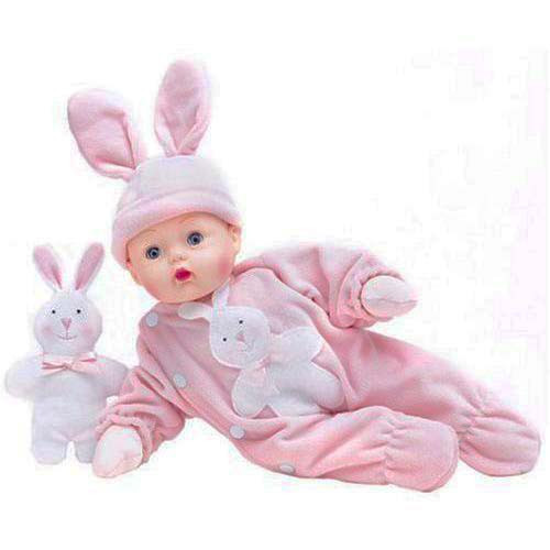 Dressed in a soft pink velour footed sleeper with a bunny applique and a bunny ears hat. She comes with a mini white plush bunny.