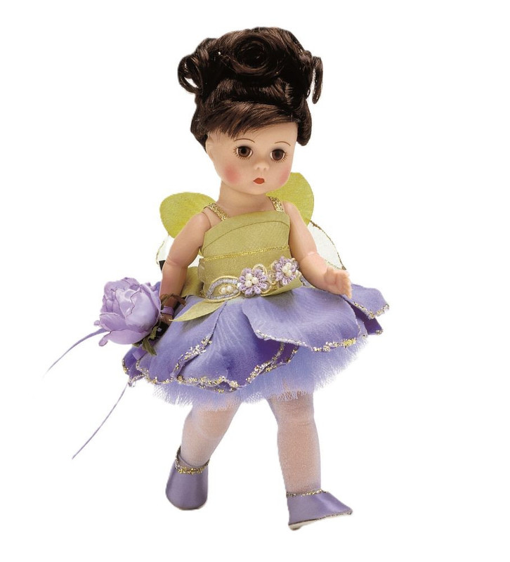 This Madame Alexander Purple Petals Fairy doll is dressed in a tutu or purple flower petals with a lime green bodice with matching wings. Her dark hair is in an up do.