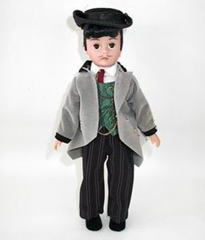 This Gone With The Wind character doll of Rhett Butler is made of a special male doll mold and dressed in a long coat jacket suit and hat.