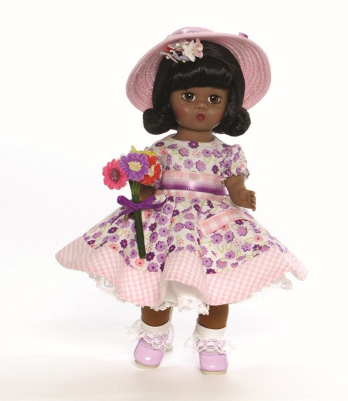 This Madame Alexander Ring Around The Rosie Black Nursery Rhyme doll wears a pink and purple flower print dress with a large hat, she comes with a bouquet of flowers