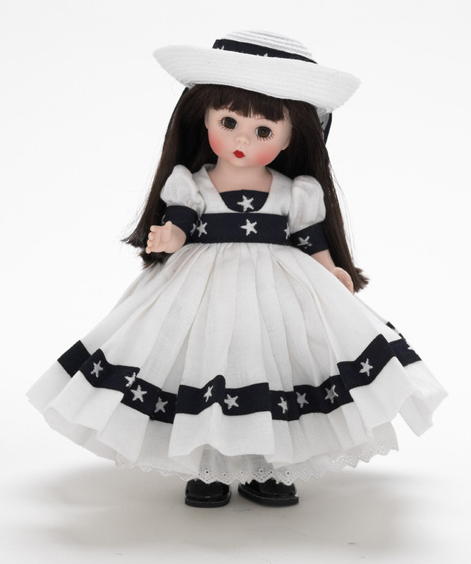 This Setting Sail Madame Alexander doll is ready to set sail on a boat in her in nautical white full dress trimmed with navy ribbons with white stars on it that matches the ribbon on her white straw hat. She has pantaloons trimmed in navy blue and black T-strap shoes.