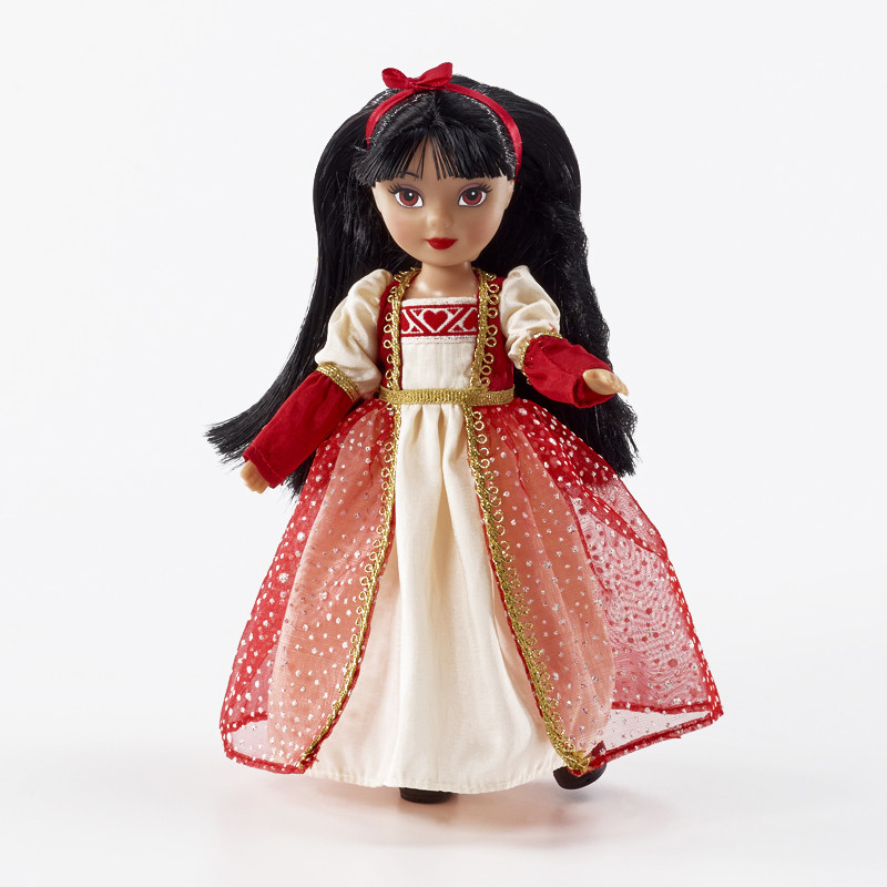 Doll is dressed in a ivory gown with a dotted red organdy over skirt, with gold trim. She has a red ribbon in her long black hair.