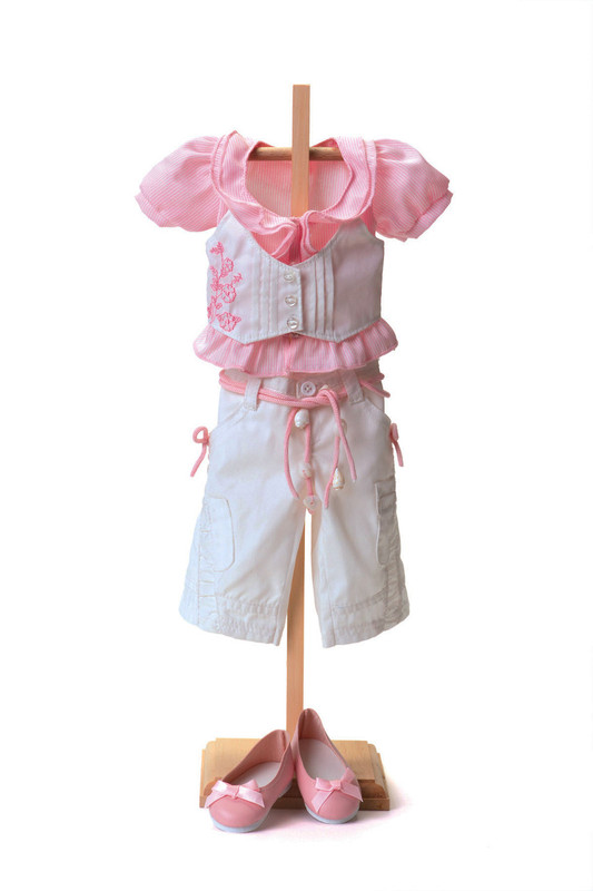 Your doll can't look any sweeter in this feminine 3 piece capri set. White embroidered vest is attached to a pink ruffled blouse. Capri pants come with self-tie belt. Pretty pink shoes with bow front.