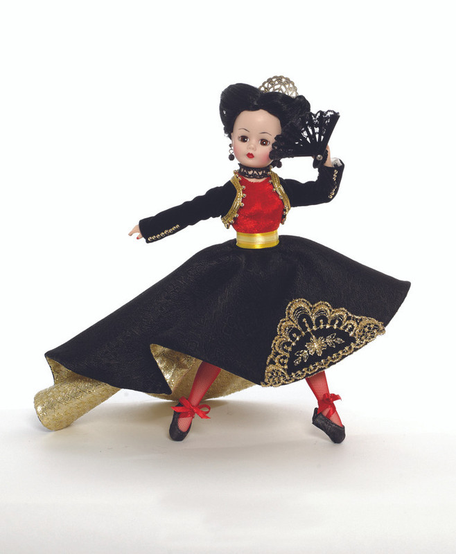 The Spanish Dancer ballerina doll is dressed in a long Spanish dancing outfit, she has long dangle earrings, pointed toes, and comes with a fan