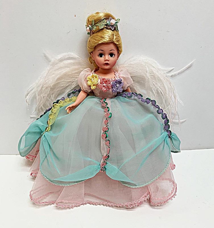 This Spring Angel is dressed for Spring in full pink organdy gown with an aqua green over skirt, the dress is trimmed with purple, pink, and yellow braiding and flowers with pearl centers. She wears a ribbon of flowers in her up do hair, has pink shimmer nylons, pink high heels, and pink feather wings.
