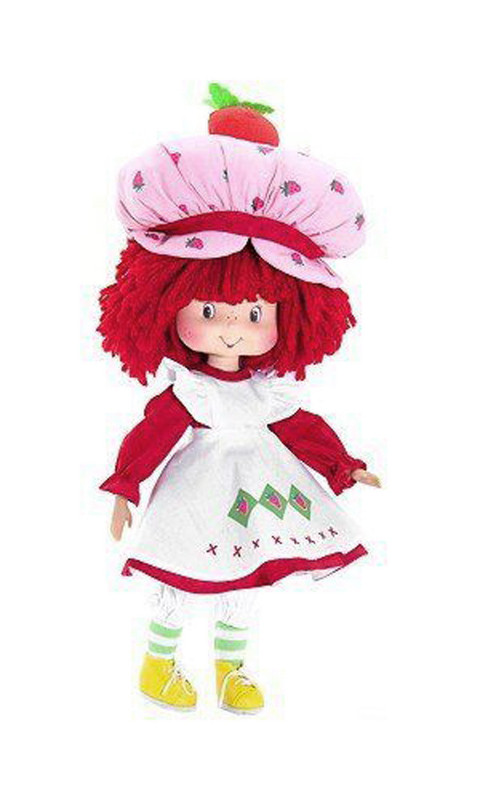 Strawberry Shortcake Madame Alexander Doll is dressed in her official Strawberryland Outfit in red with a white apron. She has a large puff pink hat with a strawberry print.