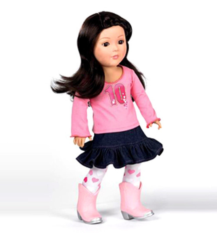 A true Urban Cowgirl in her blue jean skirt, with a pink #10 top, pink cowgirl boots, and pink heart print leotards. She has a wardrobe available to create of hours of play. Same size as American Girl play dolls...so share her clothes with your New Best Friend!