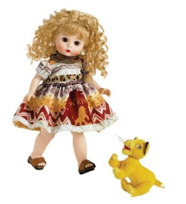 This Madame Alexander Wendy Loves The Lion King Doll Wendy is dressed in a "Lion King" print dress with a bronze beaded necklace and tan sandals. She comes with a 3" plush jointed Simba baby lion.