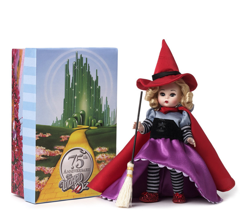 This Madame Alexander Wicked Witch Of The East Wizard Of Oz doll is dressed in her red and purple satin witch gown with cape, peaked hat, black and white striped socks and red glitter shoes, She comes with a broomstick. The Wicked Witch Of The East is the witch Dorothy's house fell on in The Wizard Of Oz.