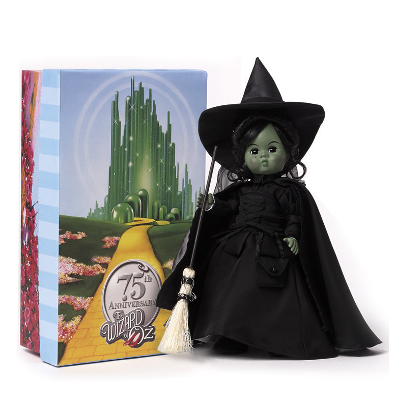 This Madame Alexander Wicked Witch Of The West Wizard Of Oz doll is dressed in all black with cape, witch hat, and broom. she has an all green face and body