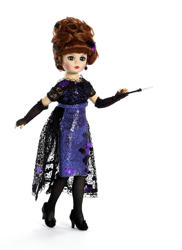 This Witchcraft doll is dressed in a purple glitter fitted cocktail style dress with lace over skirt and attached bats, she has gloves, a bat in her hair and a long cigarette, she is fashionable!
