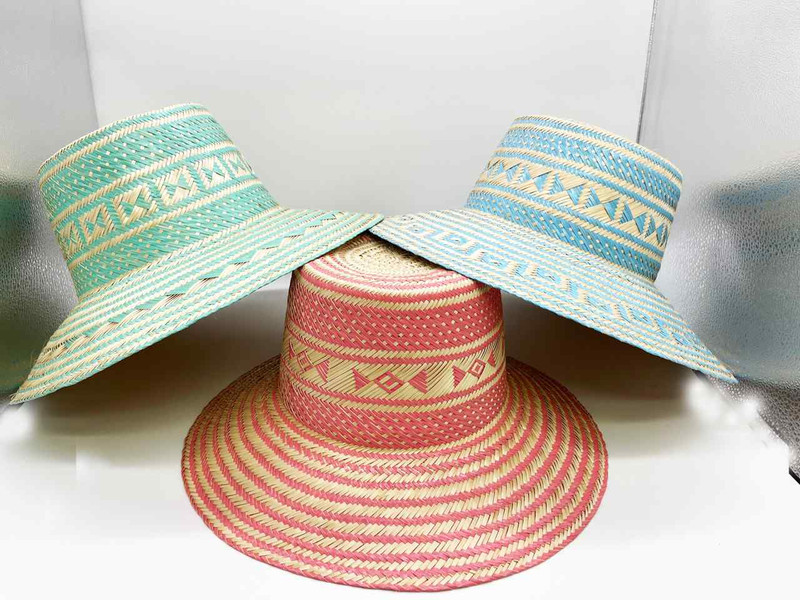 A painted palm weaved with a natural color palm in Columbia, to a pattern. When you wear this hat you will know it is unique.