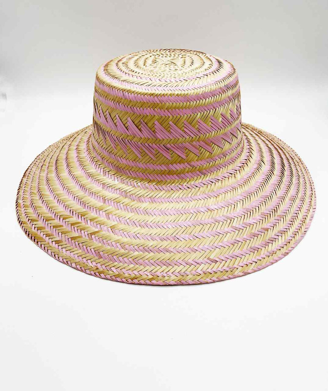 A painted pink palm weaved with a natural color palm in Columbia. When you wear this hat you will know it is unique.