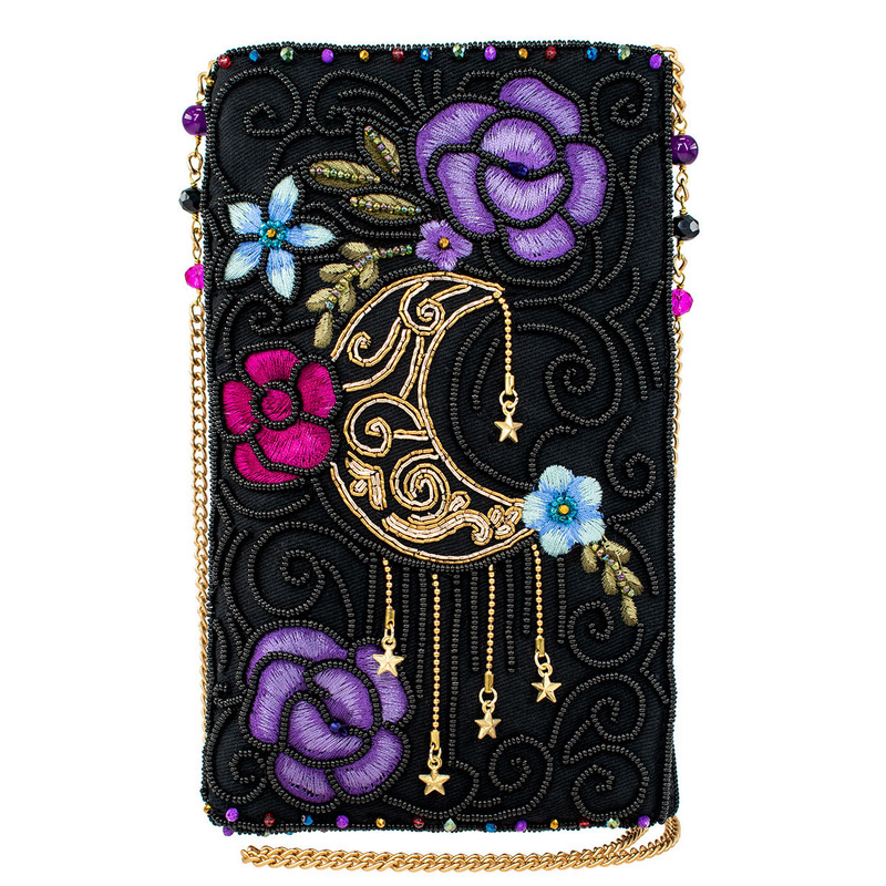 Put a little sparkle in your moonlight nights with this Mary Frances Moon Dance half a moon with dangle starts beaded crossbody phone bag. This alluring hands-free bag is fashioned with a blend of embroidered flowers and hand-laid beads and a colorful trim. This multi-functional accessory makes it easy to slide your phone in the top slip pocket and store all your essentials in the side zip pocket. Easily fits inside a larger bag to protect your phone and is ready to grab and go.