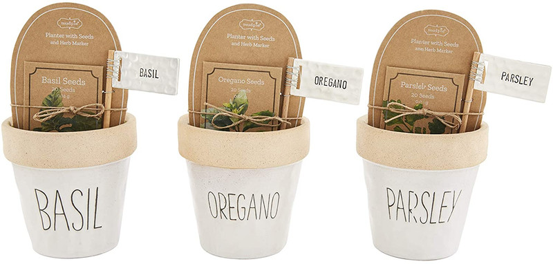 A hand-painted stoneware pot arrives with e the herb seeds of your choice and a wood soil marker.