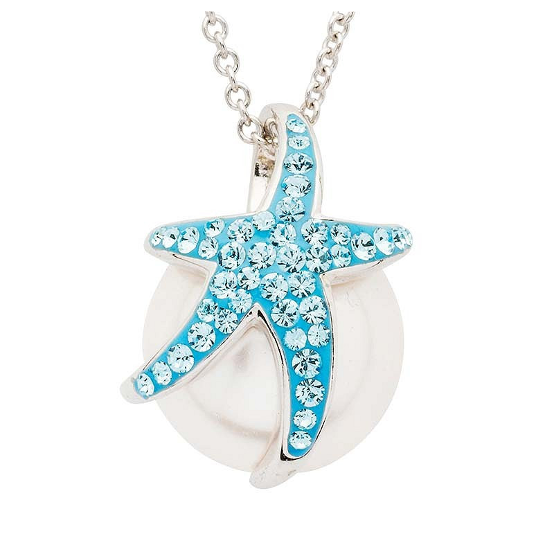 The Sterling Silver Pearl & Aqua Crystal Starfish Necklace: A 'Drops of Joy' collection masterpiece, this necklace features a sterling silver pendant adorned with aquamarine crystals. A turquoise starfish cradles a white freshwater pearl, its tip functioning as an invisible bail. A slim chain completes this aquatic-inspired beauty.