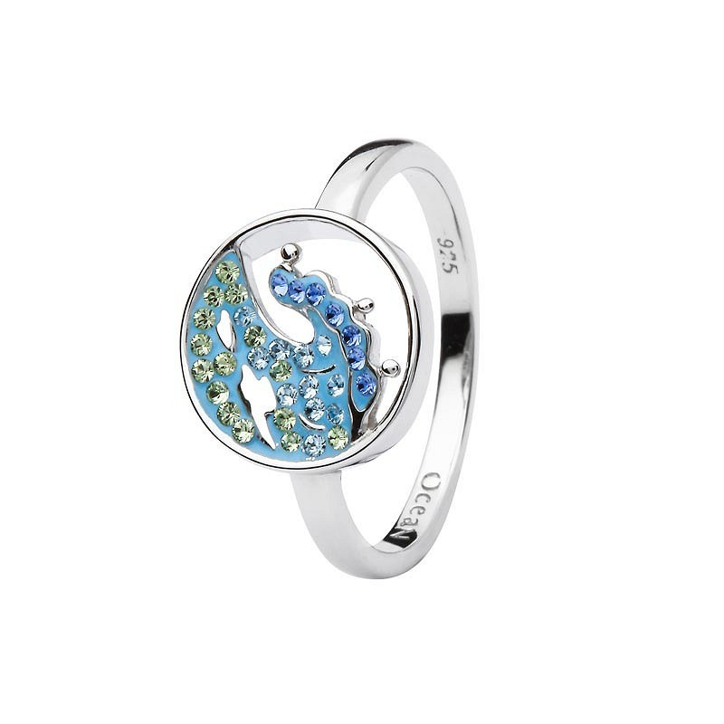 Crafted in sterling silver and adorned with deep blue, light blue, and yellow crystals of high shine, the Blue Wave Ring features a silver circle crown with an intricate wave motif filled with crystals. The plain silver band complements the design. The wave, symbolizing surfing holidays and seaside joy, adds a touch of sparkle. Slip on this ring to carry cherished memories wherever you go. For a coordinated look, explore our matching drop and stud earrings, as well as pendant necklaces from our Ocean collection.