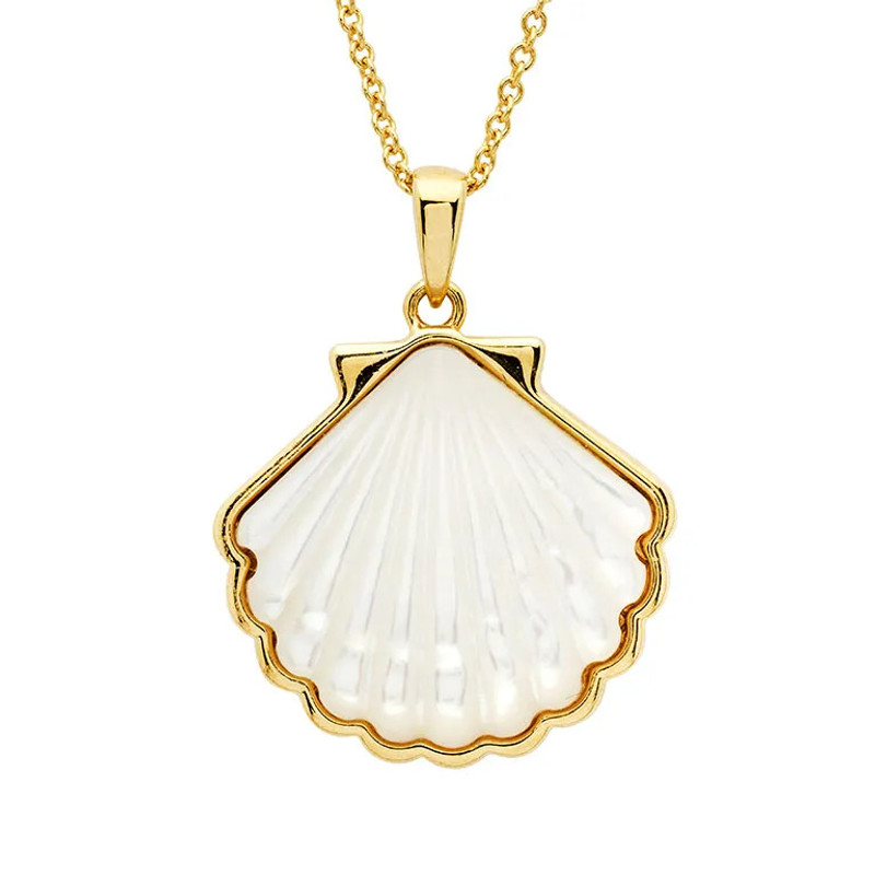 This 14KT Gold Vermeil Mother of Pearl Shell Necklace is a part of Ocean’s My Sunshine collection. Crafted in sterling silver, this shell necklace has a thick 14KT yellow gold vermeil coating. The pendant has an ivory mother-of-pearl slice set in a golden frame. Scallops and ridges add beauty to the shell pendant. Ocean’s 14KT Gold Vermeil Mother of Pearl Shell Necklace has elegance in every line and curve. It’s yellow gold hue echoes sun’s warmth and radiance. The scallop edge shell evoke feminine charms. The mother of pearl adds a nurturing influence.