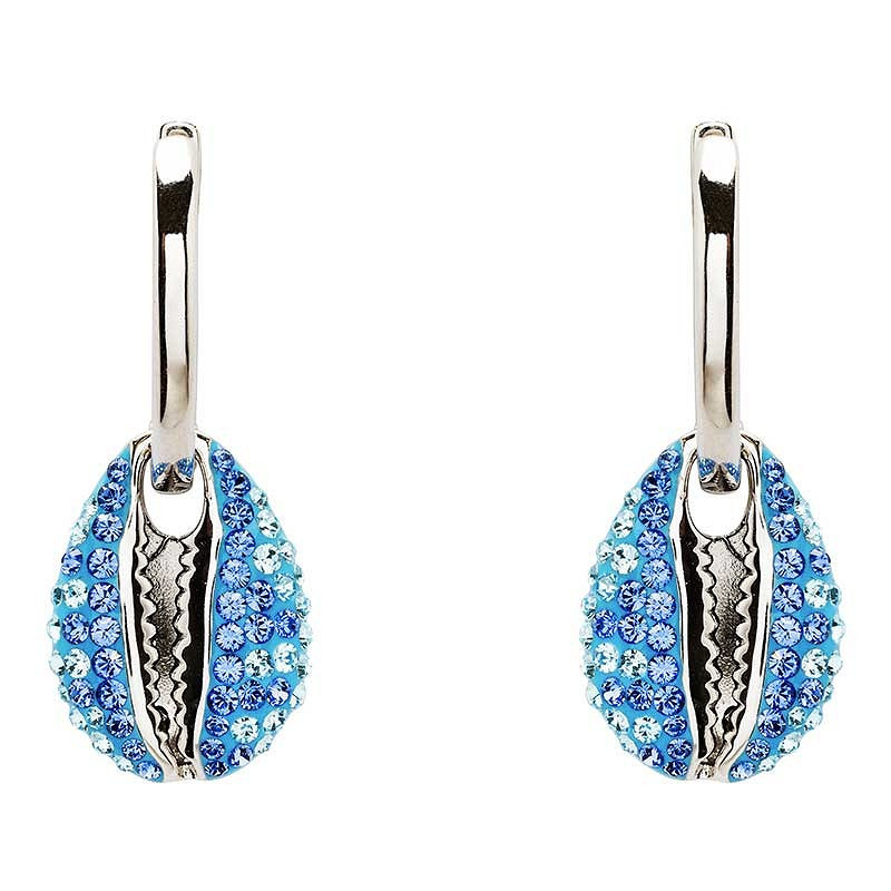 These Sterling Silver Aquamarine Crystal Pearl Cowrie Shell Earrings are an ultra-feminine accessory. Each earring has a plain upper with a blue cowrie shell drop. Sapphire blue and aquamarine crystals adorn the drop. Cowrie shells symbolize femininity, fertility, and prosperity. Their blue color evokes a link with the ocean. Sapphire and aquamarine crystals further reaffirm this connection.
