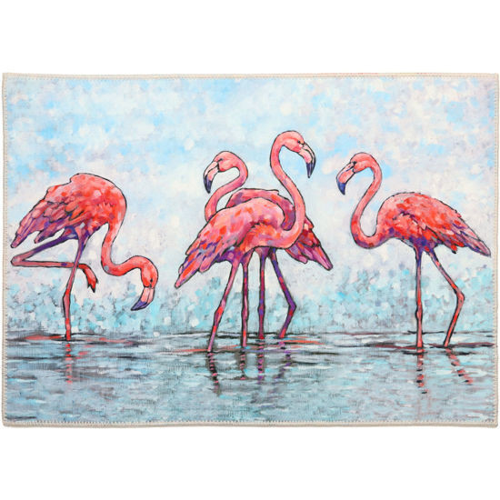 A flock of oink Flamingos wade at the water's edge on this ultra thin accent rug that will delight your guests to your tropical home decor.