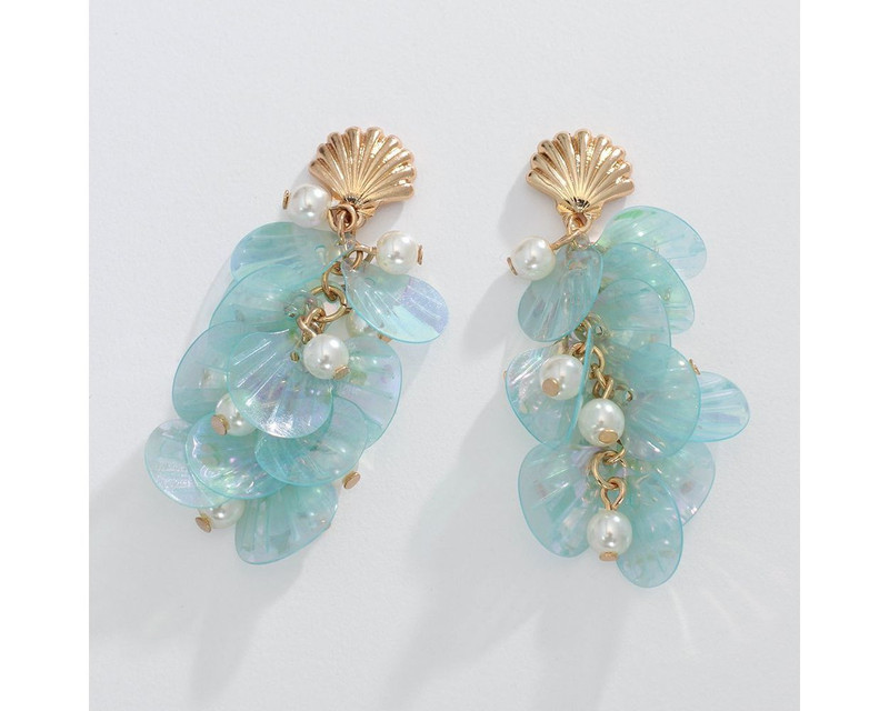 A pretty gold shell earring with aqua iridescent scallops with a dainty gold chain and pearls. This makes a great beach earrings that will sparkle in the sunshine!