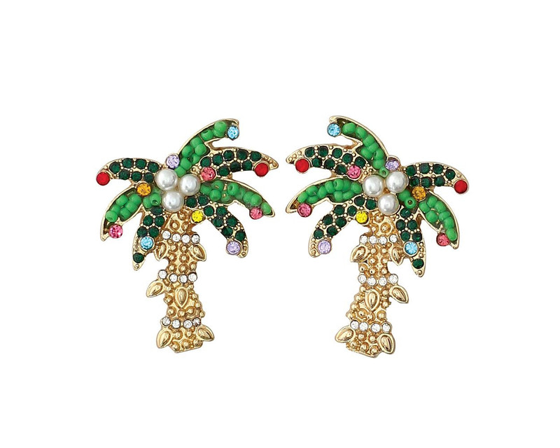Celebrate the holidays with a tropical theme of Palm Tree earrings, trimmed with pearls, colorful crystals, and seed beads.