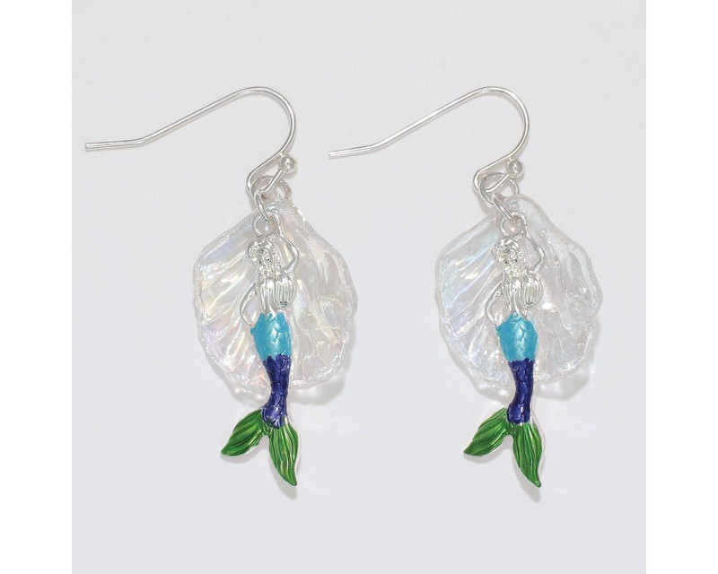 Celebrate your love for Mermaids with these beautiful Mermaid dangle earrings, a blue and green mermaid rests in a clear iridescent sea shell.