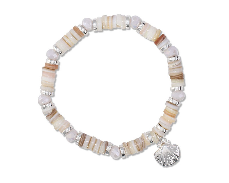 Celebrate your love for sea shells with these disc bead bracelet in a natural shade with a dangle silver scallop shell.