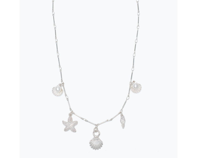 Sea shells with pearls, a starfish, and a scallop shell make up the charms on the sea charms silver necklace.