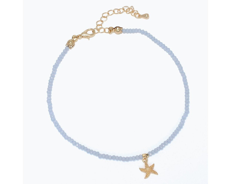 Wear this pretty soft periwinkle beaded ankle bracelet that has a gold starfish charm with anything. Beach Jewelry time!