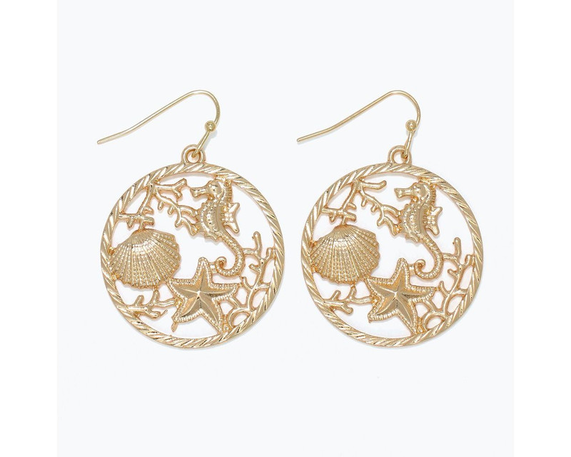 These gold round shaped earrings will remind you of the ocean with the sea life in the coral, add an ocean scene earring to your beach wardrobe..