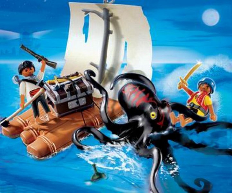 The Playmobil Pirates and Giant Octopus play set offers hours of entertainment. Snap the pieces together and the pirates will battle the octopus from their raft to protect their treasure chest!