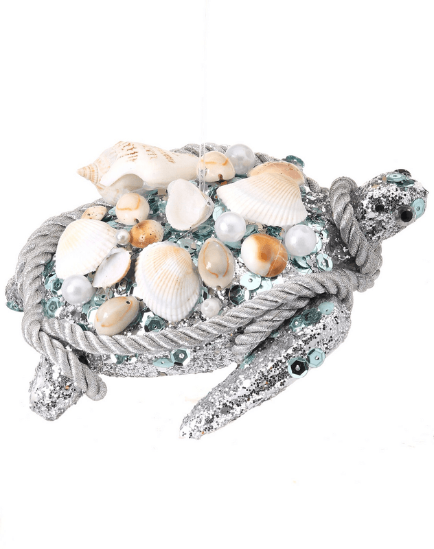 Real sea shells with glitter sequins and faux pearls decorate this silver glitter Turtle. Perfect for a sea themed Christmas tree.