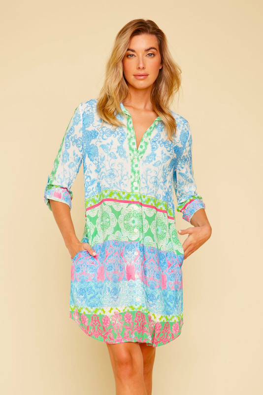 A modern artsy shirt dress design by Renuar. A print in multi colors and contracts. So simple and easy to wear anywhere.