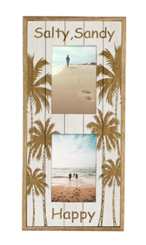 Palm Trees and wood planks give this double photo frame a seaside charm on your wall.