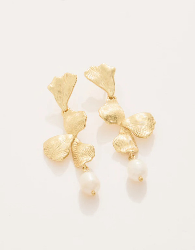 Hammered 18kt matte gold plated ginko leaves with freshwater pearls make a year round statement. Wear Spartina's Ginko Leaf Dangle Earrings to up your style on any occasion.
